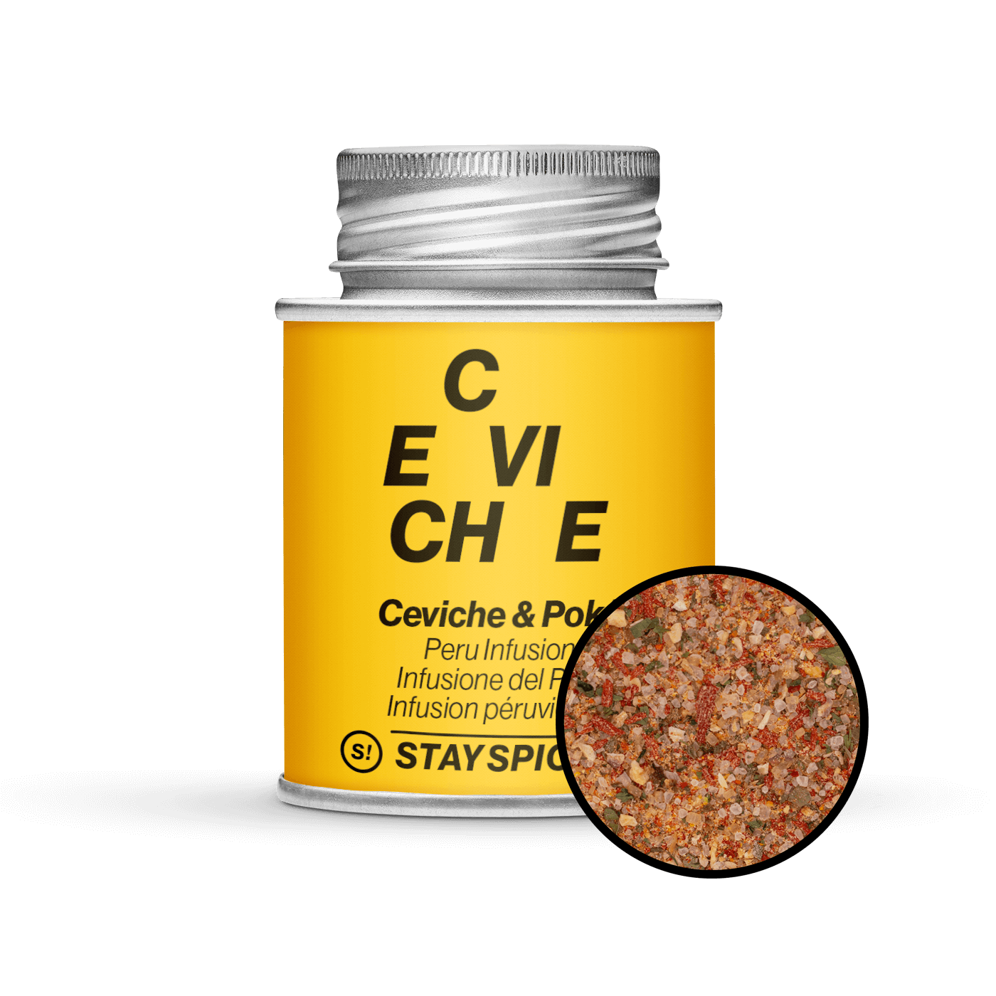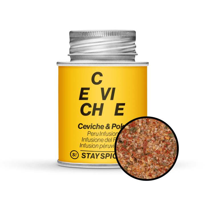 Meksikossa Cevicheä tarjoillaan usein avokadon ja tomaattien kanssa. Mausteseoksemme tuottaa tasapainoisen profiilin suolaisten, makeiden, mausteisten ja happamien sävyjen kanssa. Sitruunan happamuus ja suola hallitsevat, minkä seurauksena kala ’kypsyy’ ja sen luonnollinen makeus korostuu. Tomaatit ja Demerara-sokeri tuovat miellyttävää makeutta, kun taas šalottsipuli, valkosipuli ja sipuli antavat ruoalle syvyyttä ja potkua. Kaprikset ja Piment d’Espelette tuovat tulista ja hedelmäistä särmää, ja korianteri lisää raikasta vivahdetta, joka täydentää kokonaisprofiilia.